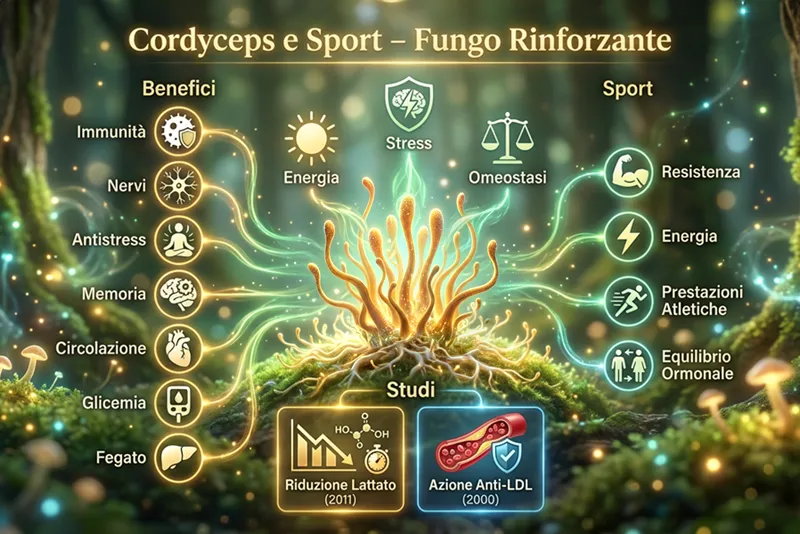Una meta-analisi pubblicata su Frontiers in Nutrition del 2025, che ha analizzato 14 studi randomizzati che coinvolgevano 528 atleti, ha confermato che l'integrazione con Cordyceps sinensis migliora in modo significativo le prestazioni di resistenza, la soglia ventilatoria e il VO2peak. I miglioramenti erano più evidenti con dosi di 2-3 grammi al giorno per almeno 8-12 settimane [5].